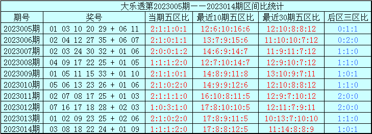 最近100期前区五区比为119:89:105:102:85,最近30期前区五区比为38:28:26:36:22,最近10期前区五区比为17:8:8:12:5,上期前区五区比为1:1:1:2:0。