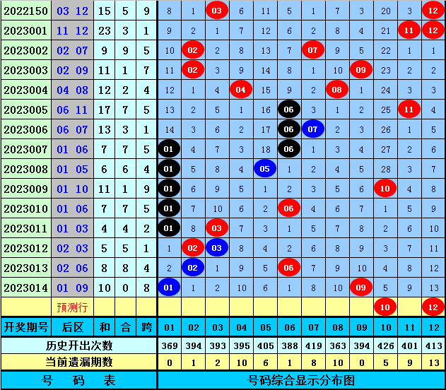 后区上期开出奖号:01和09,分别出现时一、三区,最近5期三区比为7:2:1,本期纯粹第一区号码走冷轮空,出号大限度参考06、08、10、11、12,精选两码10、12。