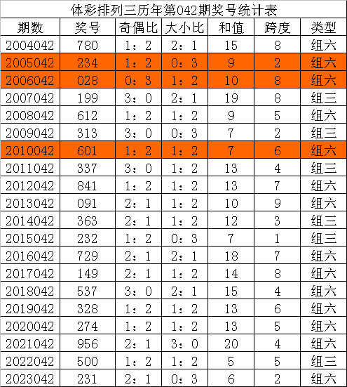 摆设三第2023042期奖号为231,奇偶比为2:1,大小比为0:3,和值为6,跨度为2。
