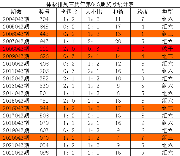 体彩摆设三积年第043期开出奖号区分为:704、845、445、947、111、626、408、286、352、530、501、751、944、508、079、603、070、054、096。统计详见下表: