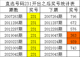 从上表统计不错看出,直选号码231开出之后,其下期奖号: