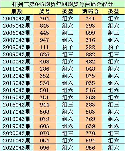 摆设三从2004年开奖于今已开出6463期奖号了,其中第043期历史同时奖号出现19次,积年第043期分裂开出号码:704、845、445、947、111、626、408、286、352、530、501、751、944、508、079、603、070、054、096。