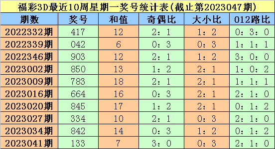 福彩3D第2023041期(上周星期一)奖号为133。其中奖号奇偶比为3:0,大小比为0:3,012路比为2:1:0。