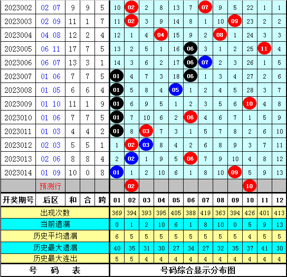 上期后区开出号码:01+09,一大一小组合、全奇组合、2路号断档。本期后区堤防一大一小组合,两码参考02、10。