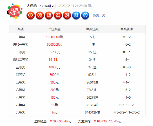 上期开奖:大乐透第2023014期开奖号码:03 08 18 22 24+01 09。其中前区号码012路比为3:1:1,奇偶比为1:4,大小比3:2。后区和值为10,跨度为8。