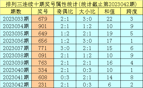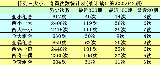 上期总结:摆列三第2023042期奖号:231。类型:组六,奇偶格局:偶奇奇,大小格局:小小小,和值:6,跨度:2。