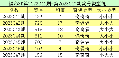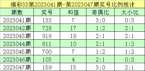 福彩3D第2023047期讲究:奖号为159,奖号奇偶比为3:0皇冠登0源码,大小比为2:1,和值为15,类型为组六。